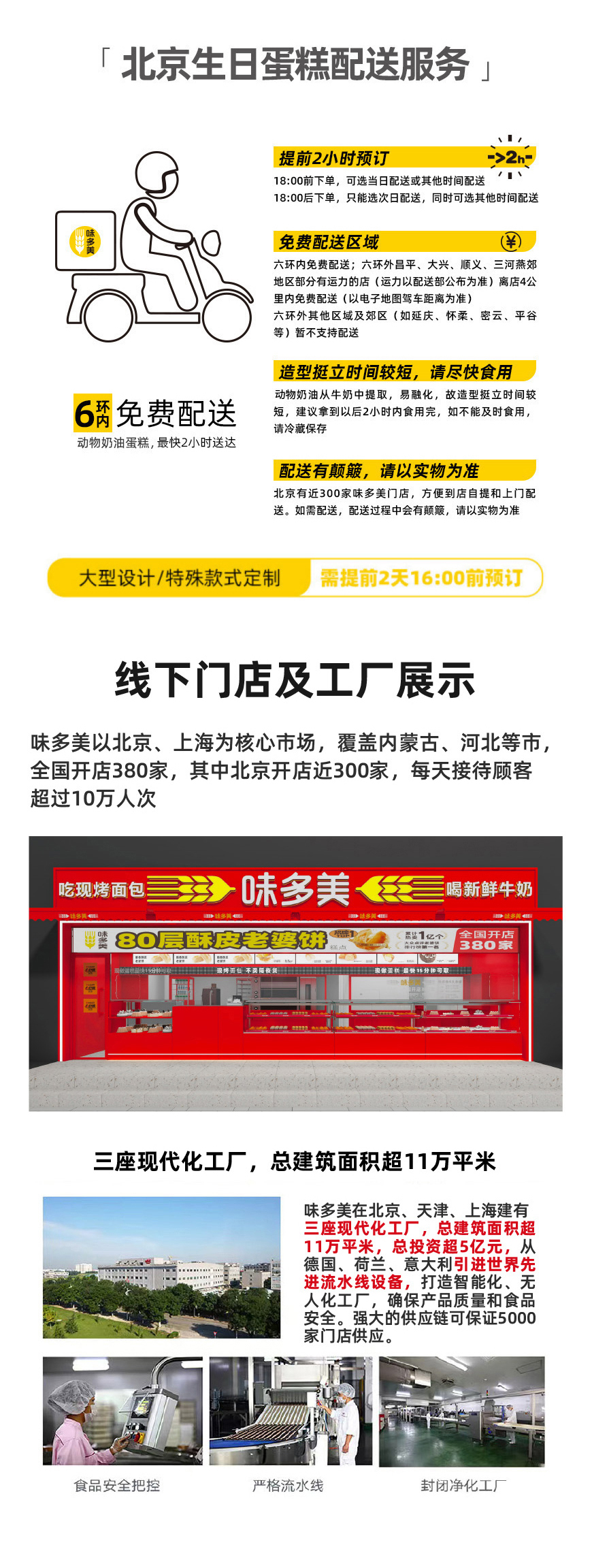 味多美线下提货卡、券支付北京市六环内,六环外地区:昌平、通州、大兴、顺义、房山、三河燕郊门店4公里范围内提前一天预定免费配送,当天预订配送加10元配送费。