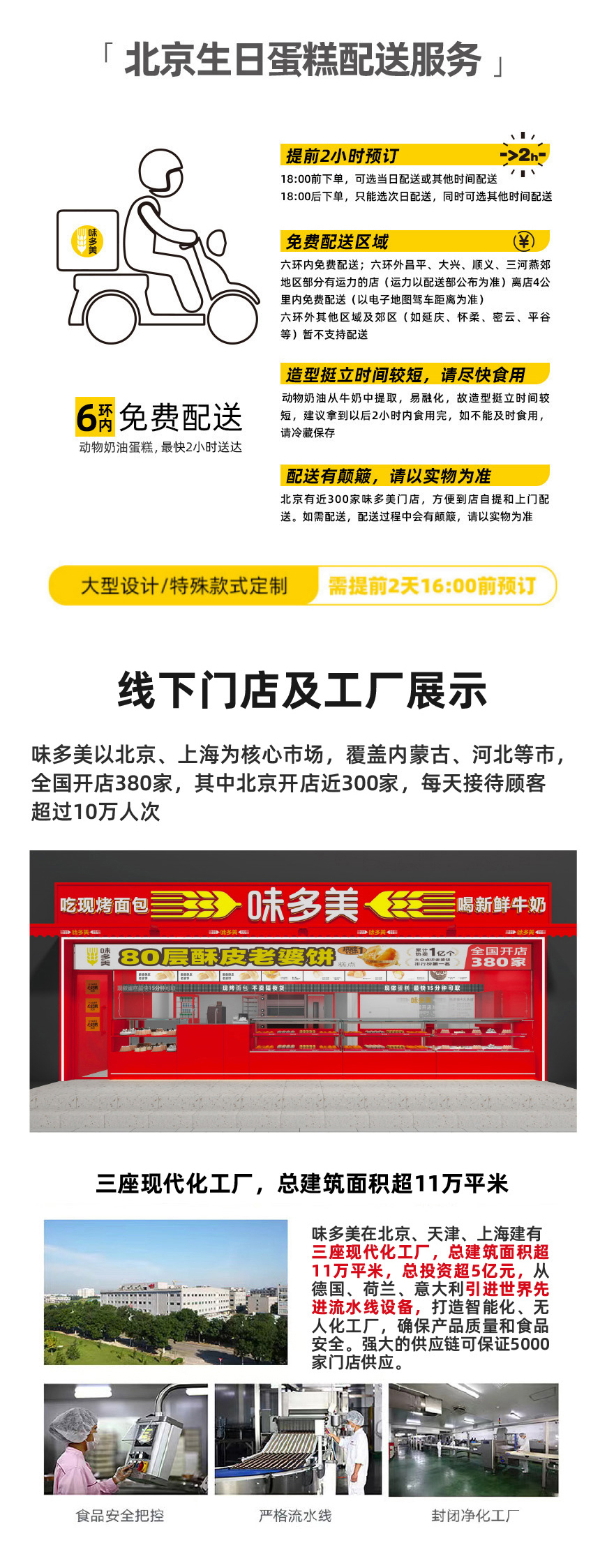 味多美线下提货卡、券支付北京市六环内,六环外地区:昌平、通州、大兴、顺义、房山、三河燕郊门店4公里范围内提前一天预定免费配送,当天预订配送加10元配送费。