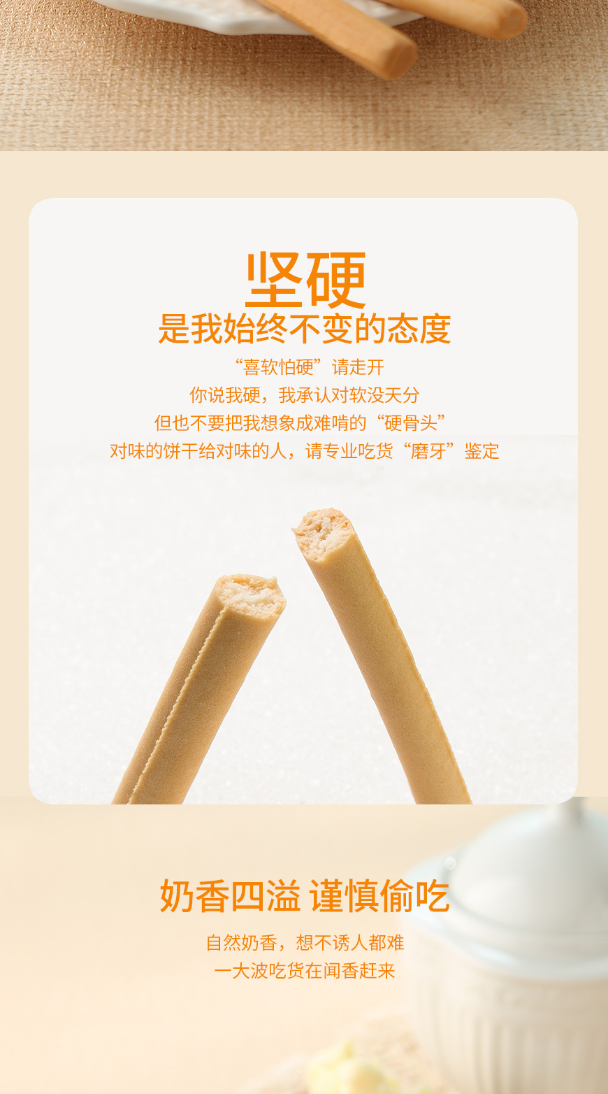 100%使用天然奶油,开盖即来的天然奶香。既是熊孩子的磨牙棒,又是大顽童的休闲零食。